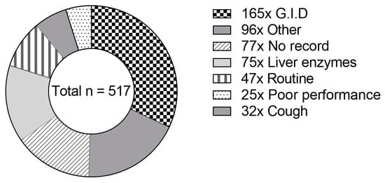 - Voigt, A.; Saulez, M.N.; Donnellan, C.; Gummow, B. Causes of gastrointestinal colic at an equine referral hospital in South Africa (1998–2007). J. South Afr. Vet. Assoc. 2009, 80, 192–198. [Google Scholar] [CrossRef][Green Version]