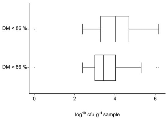 | Feed Type | n | DM (% < 86%) | Deviations Regarding Microbiological Quality (% cfu > n.c.) | |||