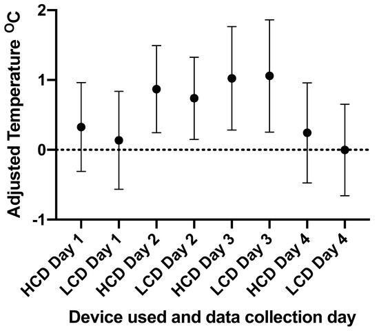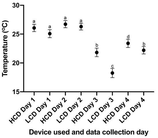 | Data Collection Day | Ambient Temperature (°C) | Humidity (%) | LCD: Mean and Standard Deviation (±°C) | HCD: Mean and Standard Deviation (±°C) |