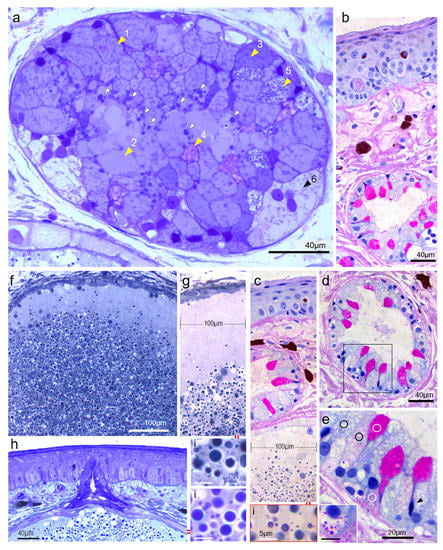 - Quagliata, S.; Malentacchi, C.; Delfino, C.; Brunasso, A.M.G.; Delfino, G. Adaptive evolution of secretory cell lines in vertebrate skin. Caryologia 2006, 59, 187–206. [Google Scholar] [CrossRef] [Green Version]