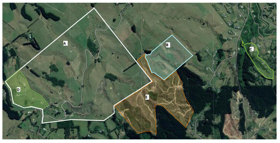 Satellite map showing the location of the two farms where a group of horses were blood sampled as part of testing for leptospiral antibodies after a leptospirosis outbreak in alpacas. Location of Farm 1 containing alpaca and horses (C), Farm 2 (A) and grazing location of horses on Farm 2 (D), land where alpaca were located part of the year (B) and access to riding trails for horses (E).