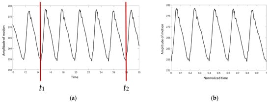 t1 and t2 were chosen as the start and the end points, respectively. The duration was then converted to a range of 0 to 1 using Equation (1):