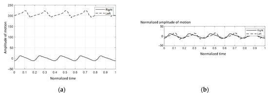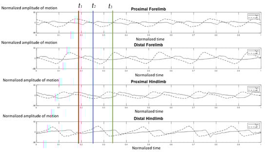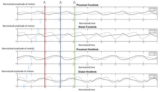 To avoid variations in data collection, it was necessary to standardize the data. As illustrated in Figure 2a, only 5 cycles of the right proximal forelimb were selected to normalize the walking duration in order to confirm that the walking speed of the elephant was steady.