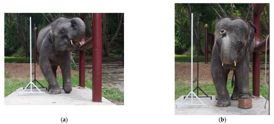 - Kongsawasdi, S.; Mahasawangkul, S.; Pongsopawijit, P.; Boonprasert, K.; Chuatrakoon, B.; Thonglorm, N.; Kanta-In, R.; Tajarernmuang, T.; Nganvongpanit, K. Biomechanical Parameters of Asian Elephant (Elephas maximus) Walking Gait. Kafkas Univ. Vet. Fak. Derg. 2017, 23, 357–362. [Google Scholar] [CrossRef]
