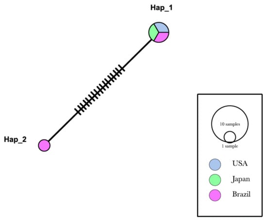 - Leigh, J.W.; Bryant, D. Popart: Full-feature software for haplotype network construction. Methods Ecol. Evol. 2015, 6, 1110–1116. [Google Scholar] [CrossRef]