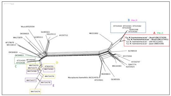 Mongruel, A.C.B.; Somma, A.T.; Pinto, A.C.A.; Campos, C.d.F.; Calado, M.I.Z.; Montiani-Ferreira, F.; Vieira, T.S.W.J.; Vieira, R.F.d.C. First Report of ‘Candidatus Mycoplasma haematomacacae’ in Laboratory-Kept Rhesus Monkeys (Macaca mulatta) Maintained in Rio de Janeiro, Brazil. Vet. Sci. 2022, 9, 443. https://doi.org/10.3390/vetsci9080443