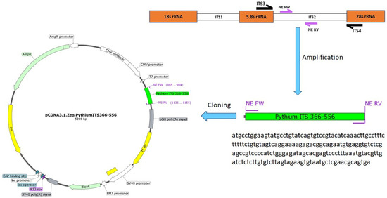 The NE primers were used to amplify the 191 bp amplicon using a Phusion Hot Start II DNA Polymerase (ThermoFisher Scientific, Waltham, MA, USA). Gel electrophoresis was used to purify the PCR product, and bands with the expected size were purified (Invitrogen™ PureLink™ Quick Gel Extraction Kit #K210012, Waltham, MA, USA). A Fast DNA End Repair Kit (ThermoFisher Scientific, Waltham, MA, USA) was used to add the phosphate groups required for ligation to the amplicons. The EcoRV restriction enzyme was used to linearize the pCDNA3.1 plasmid, followed by using the quick CIP dephosphorylation kit (New England Biolabs, Ipswich, MA, USA). The phosphorylated amplified PCR product was ligated to the linearized pCDNA3.1 plasmid using the rapid ligation kit (ThermoFisher Scientific) to create the pCDNA3.1-Pythium-ITS2 366-556 plasmid (Figure 1). The ligation mixture was used to transform Stellar™ Competent Cells (Takara Bio USA, Mountain View, CA, USA). The correct clone was identified, and the cloned plasmid was purified from a 200 mL bacterial culture using a Maxi Fast-Ion Plasmid Kit (IBI Scientific, Road Dubuque, IA, USA). The DNA yield was 1.28 mg, and the 260/280 ratio was 1.85.