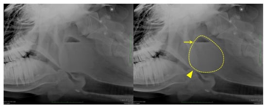 In the orthostatic position, without sedation, horizontal radiography of the head was performed with a mobile X-ray unit (Sirius Star Mobile, FUJIFILM Healthcare, Tokyo, Japan) centered on the pharynx; it showed a mass with increased soft tissue density in the dorsolateral part of the pharynx. The mass was oval, measuring approximately 12 × 11 cm, with an internal line demarcating the lower radio-opaque region from the upper radiolucent region, indicating the presence of fluids (Figure 1).