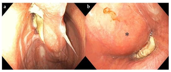 Endoscopic view of the dorsal aspect of the nasal passage and the upper respiratory tract with a retropharyngeal mass. (a) Pus-like material adherent to the dorsum of the nasal passage; (b) mass (*) in the pharyngeal region obstructing the airways.