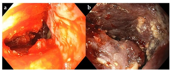 Endoscopic view of the pharyngeal abscess cavity (a) before and (b) after manual drainage and lavage.