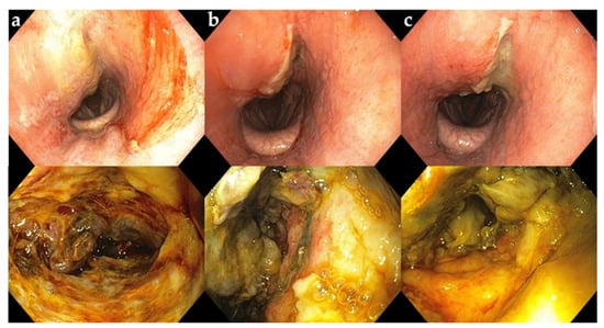 Endoscopic view of the upper respiratory area (upper row) and interior of the abscess (lower row) postoperatively after washing the cavity with povidone–iodine. (a) Day 1 after surgery; (b) day 2 after surgery; (c) day 3 after surgery.