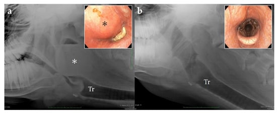 Lateral radiography of the pharyngeal area and endoscopic view via the nasal cavity. (a) Day of admission; (b) sixteen days after the surgery. Tr: trachea; *: abscess.