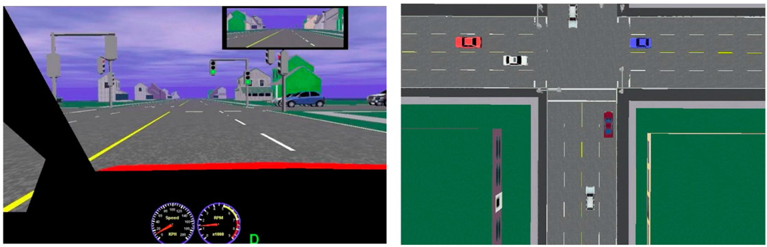 The simulator allows for a video playback of each participant’s drive. This video offers two viewing angles: one in the position of the driver, and the other is a bird’s eye view from above the driver’s vehicle (see Figure 1). It is from these two angles of analysis of the recording that we identified the driving errors of each participant, and then classified them. Two observers previously trained to use the evaluation scheme independently rated each participants’ drive. The observers were blind to which group participants belonged.