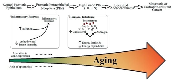 Aging is the irreversible process by which individuals undergo various physiological changes, and become vulnerable to various diseases, which in some cases can also be the cause of mortality [,]. Age is often considered an important non-modifiable risk factor for a number of diseases which include, but are not limited to neurodegenerative diseases such as age-specific Alzheimer’s disease []; cardiovascular diseases such as coronary heart disease, stroke [,], and hypertension []; and certain cancers [,] including prostate cancer (PCa) [,].