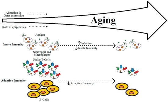 It is well-established that adaptive immunity declines with progressing age, due to factors such as reduced production of naïve T-cells, reduced diversity of antigen-recognition repertoire, alterations in signal transduction in T-cells with changes in the cytokine induction patterns, and reduction in expansion of clonal and functional specific T- and B-cells, as shown in Figure 2 [,]. Aging of the thymus can also be linked to decreases in the production of naïve T-cells []. Alterations in innate immunity alone due to aging may not be the cause of immunodeficiency in individuals, but lead to dysregulation of immune response []. This dysregulation of immune response in aging individuals can eventually lead to either loss or gain of immune activity [,,,,]. The gradual decrease of naïve T-cells, accumulation of memory T-cells and the effector CD8+CD28- T-cells, which are instrumental in over-secretion of pro-inflammatory cytokines, can lead to an imbalance in the pro- and anti-inflammatory networks [,,].