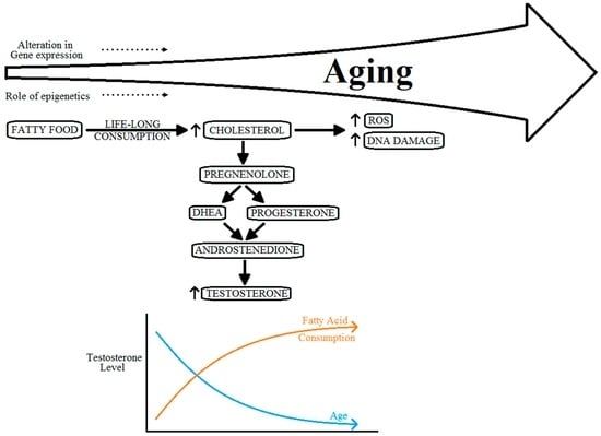 Various circulating androgens, including testosterone, have important roles in the growth of the prostate gland, and PCa []. The specific pathway mechanism or the role of testosterone level on progression of PCa, however, is still to be well defined []. The level of circulating testosterone in men more than 45 years of age, across various ethnicities, shows a tendency to converge down as compared with vastly varied levels in men of age less than 30 years []. Many researchers have shown that higher levels of circulating testosterone do not correlate with an increased risk of PCa [,]. However, low levels of serum testosterone do have a direct correlation with progression of the disease to aggressive PCa [,,,]. Moreover, with a life-long consumption of fatty food substances, the levels of testosterone can also be affected by this. These absolutely contradicting effects on the levels of testosterone can also cause hormonal imbalance, as shown in Figure 4.