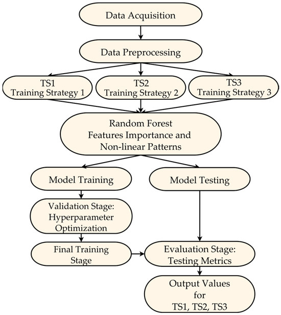- Initial data splitting: The entire dataset is split into training and testing sets according to the partitioning strategy used (ST1, ST2, and ST3). For example, in ST3, the data from 2012 and 2015 formed the training set, while the 2018 data were reserved as the final or independent testing set;