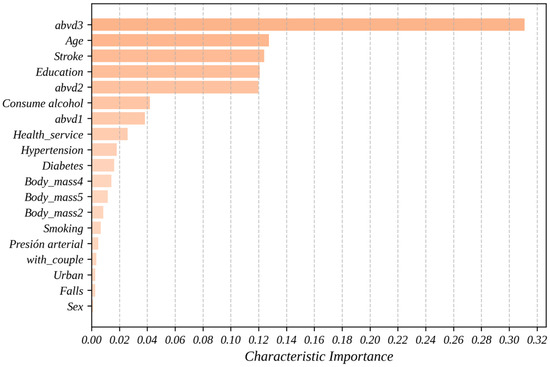 The variable importance analysis revealed that limitations in basic activities of daily living (abvd3) were the most significant predictor, with a 31.1% contribution to the model’s performance. Other key factors included age (12.75%), history of stroke (12.40%), educational level (12.08%), and difficulties in two basic activities of daily living (abvd2, 11.98%). The identification of education level as a relevant factor highlights the need to consider socioeconomic determinants in public health strategies.