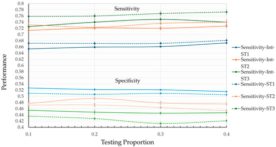 An important observation from Figure 3 and Figure 4 is that ST2 is the only model that presents balanced results across the metrics studied. In sensitivity, ST2 remains significantly greater than ST1 and approaches the performance of ST3 across all test ratios. Comparing the best values, ST1 reaches 0.6812 while ST2 achieves 0.7402, representing an 8.7% increase in sensitivity. The percentage difference between ST2 (0.7402) and ST3 (0.7729) is 4.2% in the same metric. A similar pattern is observed in the specificity metric, where ST2 outperforms ST3 and approaches ST1.