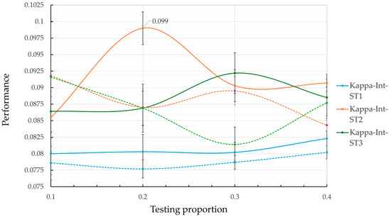 Regarding the kappa coefficient metric (Table 2 and Figure 4), results that include variable interaction consistently outperform those without interaction across almost all test ratios. The best performance in the kappa coefficient was achieved by ST2, which reached a value of 0.099 at a test ratio of 0.2. The typical error of ±0.0248 suggests that this result is statistically significant, with no overlap in error intervals compared to other strategies. This indicates that ST2 presents better agreement between predictions and actual observations, highlighting its effectiveness compared to the other evaluated strategies.