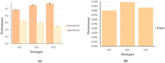 (a) Model performance in sensitivity and specificity for ST1, ST2, and ST3 with variable interaction and a test ratio of 0.2; (b) kappa coefficient performance for ST1, ST2, and ST3 under the same configuration.