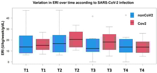 The most pronounced between-group difference was observed at T3, where CoV2 patients maintained significantly higher ERI values compared to non-CoV2 ones (difference in the medians = 5.9 U/kg/week/g/dL, p = 0.013). By T4, both groups converged to similar ERI levels (13.5, 8.4–18.4 U/kg/week/g/d for CoV2 patients and 13.6, 8.9–19.3 U/kg/week/g/dL for nonCoV2 patients), suggesting a delayed recovery in erythropoietin responsiveness among COVID-19 patients.