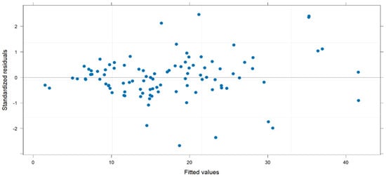 Dispersion plot of standardized residuals against the fitted values.