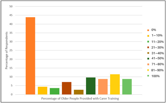 When asked if carer training is currently offered to people following a fracture, 50 respondents (44%) reported that this was not offered. When offered, this was not consistent. Between 8 and 12% of respondents reported offering carer training to the majority of their patients following fracture (Figure 2).
