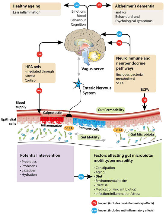 Research focused specifically on AD has shown that increased levels of neurotoxic proteins in the brain and circulating pro-inflammatory cytokines correlate with a lower abundance of the butyrate-producing anti-inflammatory bacterium Eubacterium rectale and higher levels of pro-inflammatory Escherichia coli and Shigella [33]. This is a key finding as neuro-inflammation is associated with cognitive decline, but research is needed to understand any associations between cognition and the gut microbiota composition [34].