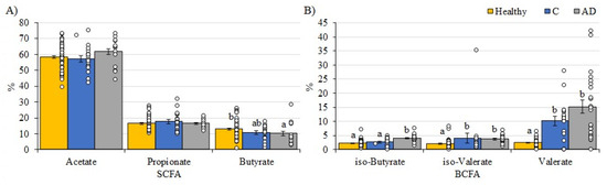 Percentages of specific fatty acids as proportions of total fatty acids detected in fecal samples from the AGE-GB study cohorts (Controls—Blue; AD—Grey) compared to a healthy adult (yellow). (A) SCFA; (B) BCFA. Healthy adults are values from 78 free-living healthy individuals [41]. Mean values (+/− standard error of the mean) and individual values are plotted. Superscripts indicate significant differences (p < 0.05) between values. Note the y-axis scale is different between panels (A,B).