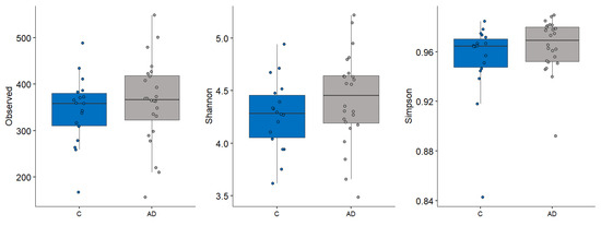 Different alpha diversity metrics showing no significant difference in the microbial diveryes tsity between control (blue) and those with AD (grey).