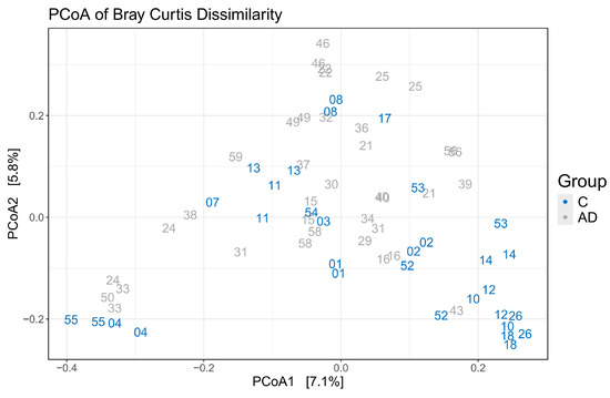 Alpha diversity metrics, measuring the within group diversity, found no significant differences in microbial diversity between the control and AD cohort (Figure 3). Bray–Curtis dissimilarity calculations showed that the two replicate samples from the same volunteer (when available) clustered closely together (Figure 4), justifying the use of the mean scores for group comparisons. PERMANOVA testing of volunteers was confirmed to be a significant factor affecting microbial composition, with volunteer differences explaining 90.7% of the variation in sample composition in the unmerged dataset (p = 0.0001). Additional PERMANOVA testing of the Bray–Curtis dissimilarity matrix showed that overall, the microbial composition was influenced by care home (R2 = 0.30668, p = 0.042) but not cohort (R2 = 0.02587, p = 0.2133). The effect of care home is likely due to the uneven distribution of participants residing in different care homes among the study groups. For instance, 4/13 care homes recruited only individuals to the control group. This variable was thus included in models testing other variables. Age and gender had no significant impact on microbial composition. There were also no significant compositional differences between the two AD groups (AD versus ADCB) when they were compared directly (p = 0.083).