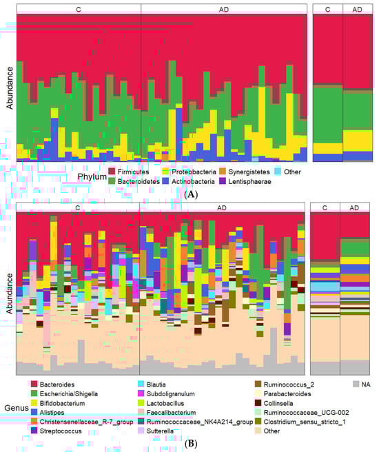(A,B) Relative abundance of most abundant taxa showing data for each individual sample on the left and combined study groups C and AD on the right. (A) Phylum level; (B) genus level. The most abundant 17 genera across the entire sample set are shown in order of average abundance (top to bottom).