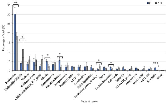 Relative abundance of the 23 most prevalent bacterial genera present at >1% of total in Controls (n = 19, Blue), compared to the combined AD groups (n = 24, Grey). Mean values (+/− standard error of the mean) are plotted. Significant differences between groups are indicated by asterisks (*, **, *** correspond to p < 0.05, p < 0.01, p < 0.001 respectively).