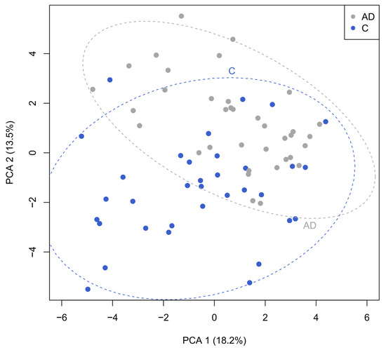 Principal component analysis investigating correlations between bacteria and fecal metabolites revealing the clear separation between the control (blue) and AD cohorts (grey).