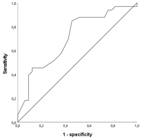ROC analysis was performed using Stroop’s interference condition scores and SCD as a positive success criterion. This analysis resulted in an area under the curve (AUC) of 0.706, 95% CI [0.580–0.831], p = 0.004; this value means that the model has a fair diagnostic accuracy. Figure 1 illustrates the curve relating sensitivity to the 1-specificity. According to Youden’s index, an ideal cut-off = 49 in the Stroop’s interference condition (naming word’s colors) was determined, corresponding to a sensitivity of 0.848 and a 1-specificity of 0.455.