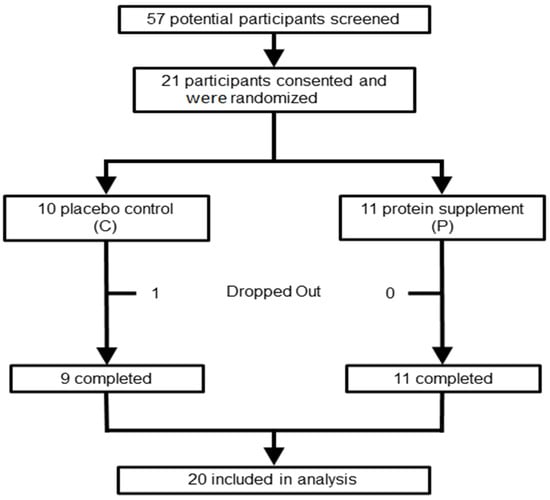 Twenty-one participants consented and were randomized to a treatment group (Figure 1). Twenty participants successfully completed the 16-week study period. One participant in the placebo group was unable to complete the study and was not included in the final analysis. The participants’ demographics and health conditions (comorbidities/medications) are summarized in Table 1 and Table 2, respectively.