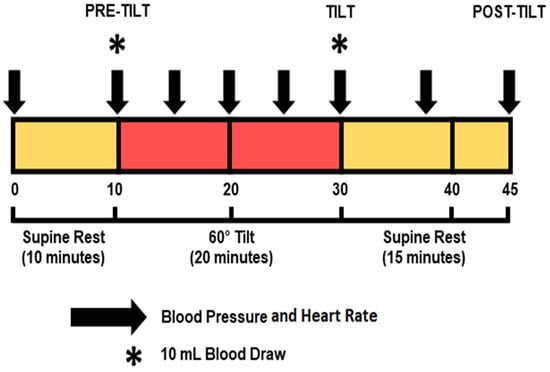 Blood (10 mL) was collected pre- and post-treatment during the tilt table procedure at 10 min of supine rest immediately before tilt and after tilt at the 30 min time point (Figure 2). Blood samples were evaluated for levels of vasopressin (ADH) and pro B-type natriuretic peptide (proBNP) by LabCorp, Inc. (Little Rock, AR, USA). As this was a pilot study, subjects were not evaluated for blood glucose or insulin levels; all blood samples were collected via random sampling.