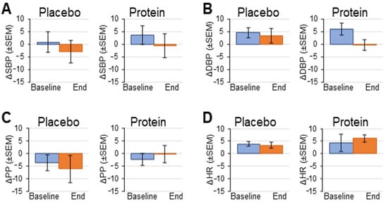 Group hemodynamic changes in tilt (from pre-tilt to tilt) at study baseline and at the end of 16 weeks of protein supplementation or placebo control. (A) Systolic blood pressure change (SBP); (B) diastolic blood pressure change (DBP); (C) pulse pressure change (PP); (D) heart rate change (HR). Data are means ± SE.