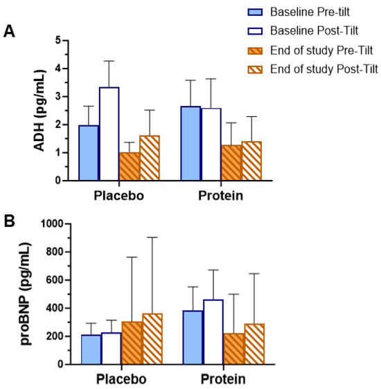 Blood levels of ADH (antidiuretic hormone) and proBNP (propeptide of brain natriuretic peptide) were measured pre- and post-treatment during the tilt table test. Blood was drawn immediately before tilt and after 20 min of tilt (Figure 4). There were no significant differences between groups for either measure (Figure 4A,B); however, there was a trend toward a significance decrease in proBNP level in the protein group between pre- and post-treatment (p = 0.08) while levels increased in the placebo group (Figure 4B). ProBNP was also higher post-tilt vs. pre-tilt for both groups throughout the study (Figure 4B).