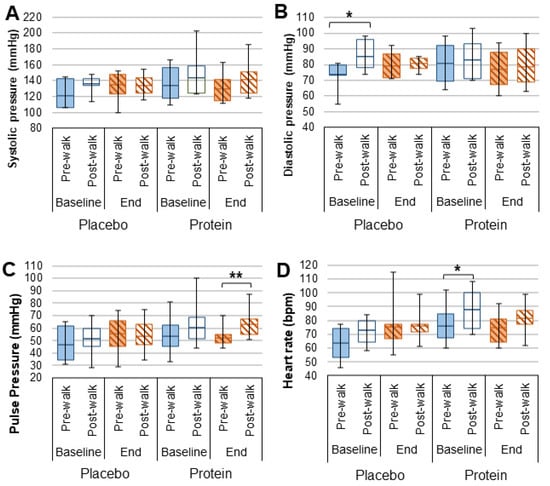 (A–D) Hemodynamic changes before and after 6 min walk tests performed before (baseline) and after (final) 16 weeks of protein supplementation or placebo. Significant difference from pre-walk: * p < 0.05; ** p < 0.01. There were no differences in distances walked.
