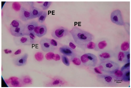 Nasal cytology of atrophic rhinitis. The mucous epithelium is represented by platicellular elements (PE) that have replaced the ciliated and mucous cells. MGG staining, 1000× magnification.