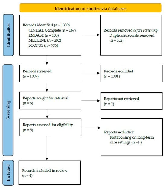A total of 1339 articles were identified from the databases (CINHAL Complete: 167; EMBASE: 105; MEDLINE: 292; SCOPUS: 775). After the removal of duplicates, 1007 articles remained for screening. After title and abstract screening, 1001 articles were excluded, which left six articles to be assessed for eligibility. One article was excluded due to the unavailability of the full text. The remaining five articles were read in full, and one article was excluded because it focused on FEES in a specific patient group (geriatric schizophrenic patients) instead of long-term care settings. A total of four articles were included in this review (see Figure 1 for the PRISMA flow diagram).