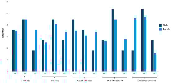 Distribution of EQ-5D dimensions according to participants’ gender.