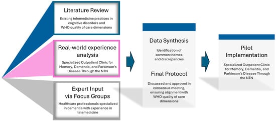 Our methodology combined three key elements: (i) a comprehensive literature review, (ii) our practical three-year experience gained from the DEM-NTN, and (iii) three (3) focus groups with healthcare experts in dementia and experience in telemedicine. The final protocol was developed based on the critical synthesis of the data obtained from these three (3) sources (Figure 1).