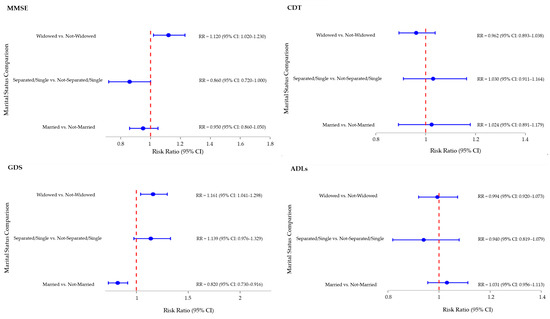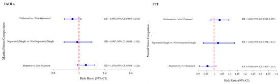 Multivariate Analysis—Log-Binomial Regressions Forest Plot: Association between marital status and performance tests. Notes: This figure presents RRs and 95% CIs from Log-Binomial Regression models evaluating the association between marital status and performance on MMSE, CDT, GDS, ADLs, IADLs, PPT, POMA, ESS, and MNA. The Forest Plots represent the Risk Ratio for each marital status category compared with the combination of the other two categories (e.g., Widowed vs. Not-Widowed, where “Not-Widowed” includes both Married and Single/Separated participants). Models were adjusted for age, sex, and education (except for MMSE models, which were adjusted only for sex), which were not included in the Forest Plot. RR values are displayed with 95% Confidence Intervals. Abbreviations: ADLs: Activities of Daily Living; CDT: Clock Drawing Test; CI: Confidence Interval; ESS: Exton-Smith Scale; GDS: Geriatric Depression Scale; IADLs: Instrumental Activities of Daily Living; MMSE: Mini-Mental State Examination; MNA: Mini-Nutritional Assessment; POMA: Tinetti Performance-Oriented Mobility Assessment; PPT: Performance-Based Physical Test; RR: Risk Ratio.