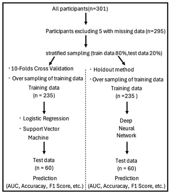 The dataset showed class imbalance, with 236 individuals who participated in social activities (80%) and 59 who were non-participants (20%) (Table 1). Predictive analyses were performed using ML techniques, with all 18 measured items as explanatory variables and the presence or absence of social participation as the outcome variable. The holdout validation method was used in the DNN, and the data was randomly split into a training set (80%, 235 individuals) and a test set (20%, 60 individuals) (Figure 1).