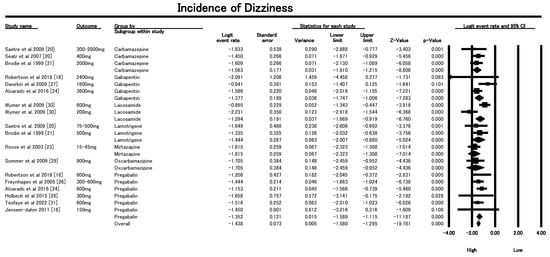 Sensitivity analysis was performed to evaluate the robustness of the dizziness findings by excluding three influential trials, as shown in Supplementary Figure S2 (Dworkin et al., 2009 [], and Wymer et al., 2009 []). After their removal, the pooled logit event rate for dizziness remained consistent with the primary analysis, indicating minimal change in the overall incidence estimate. Importantly, heterogeneity was further reduced, with the I2 value declining from 22.3% in the initial model to 0% in the sensitivity analysis. This substantial reduction confirms that variability across studies was largely attributable to these outlying trials, which involved higher dosing regimens or distinct trial populations. The persistence of similar effect sizes alongside the disappearance of heterogeneity underscores the stability and reliability of the association between AED use and dizziness. These results suggest that the observed prevalence of dizziness is not dependent on any single study and reflects a reproducible and robust safety signal.