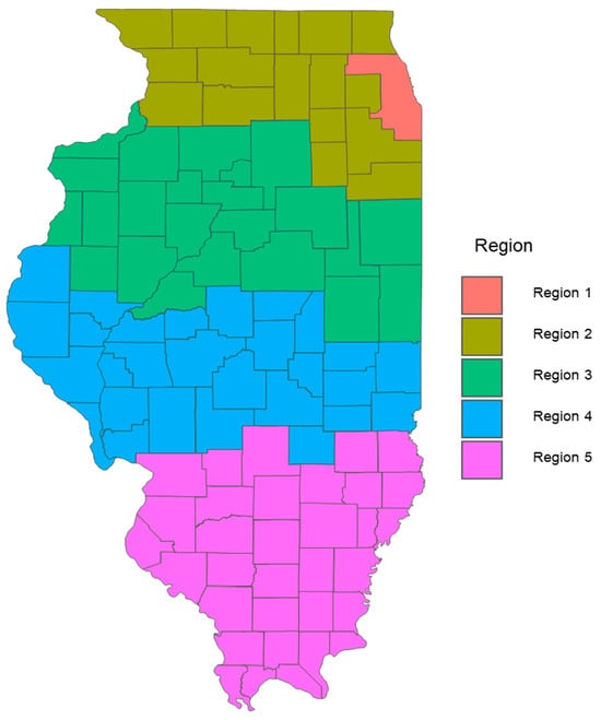 Regional Definitions of the Illinois Department of Human Services (IDHS). This figure illustrates the five regions defined by the Illinois Department of Human Services (IDHS) for analyzing healthcare and demographic data related to Alzheimer’s disease. The regions are delineated to aid in understanding the geographic distribution and prevalence of Alzheimer’s, facilitating targeted public health initiatives and resource allocation. A map is adapted from the IDHS website. https://www.dhs.state.il.us/page.aspx?item=55223 (accessed on 1 January 2020). Region 1: Cook, Region 2: Jo Daviess, Stephenson, Winnebago, Boone, McHenry, Lake, Carroll, Ogle, DeKalb, Kane, DuPage, Whiteside, Lee, Kendall, Grundy, Will, Kankakee, Region 3: Rock Island, Mercer, Henry, Bureau, LaSalle, Henderson, Warren, Knox, Stark, Putnam, Marshall, Livingston, Ford, Iroquois, Vermillion, Champaign, McLean, Woodford, Tazewell, Mason, Peoria, Fulton, McDonough, Region 4: Hancock, Adams, Schuyler, Brown, Cass, Menard, Logan, Dewitt, Piatt, Douglas, Edgar, Clark, Coles, Cumberland, Effingham, Shelby, Moultrie, Macon, Christian, Montgomery, Sangamon, Morgan, Macoupin, Green, Jersey, Calhoun, Scott, Pike, Region 5: Madison, Bond, Fayette, Clay, Jasper, Crawford, Lawrence, Richland, Edwards, Wabash, Wayne, Marion, Clinton, St. Clair, Monroe, Randolph, Washington, Jefferson, Perry, Jackson, Franklin, Hamilton, White, Williamson, Saline, Union, Johnson, Pope, Hardin, Alexander, Pulaski, Massac, Gallatin.