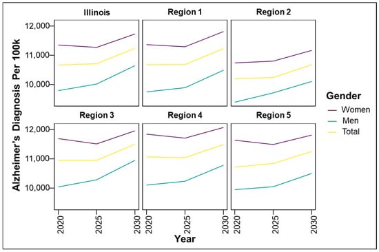 Predicted regional trends of Alzheimer’s disease (AD) cases by gender across Illinois and the five Illinois Department of Human Services (IDPH) Regions from 2020 to 2030.